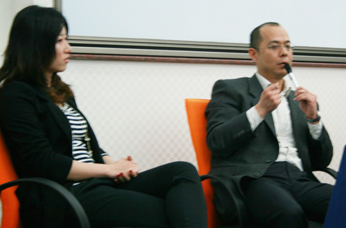 小组讨论环节:喜科销售经理宣晓玲(左)和万国纸业技术经理刘据(右)