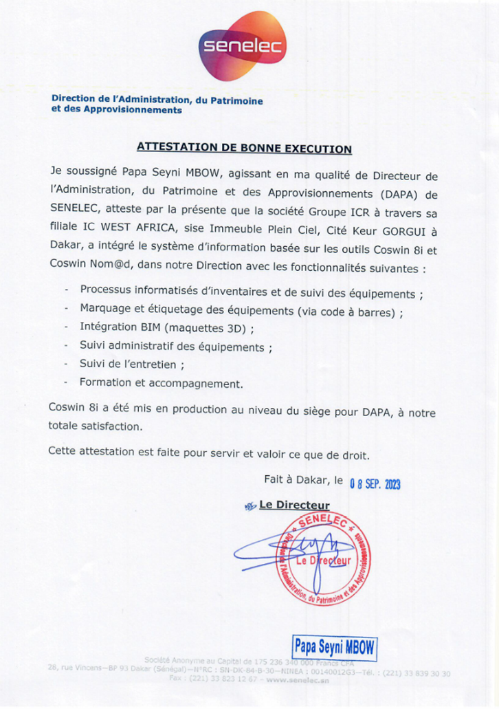 自2013年起,SENELEC开始使用Coswin系统,该系统最初部署于用于能源生产的Cap des Biches C4发电厂,随后逐步扩展至所有发电厂以及输配电网络。