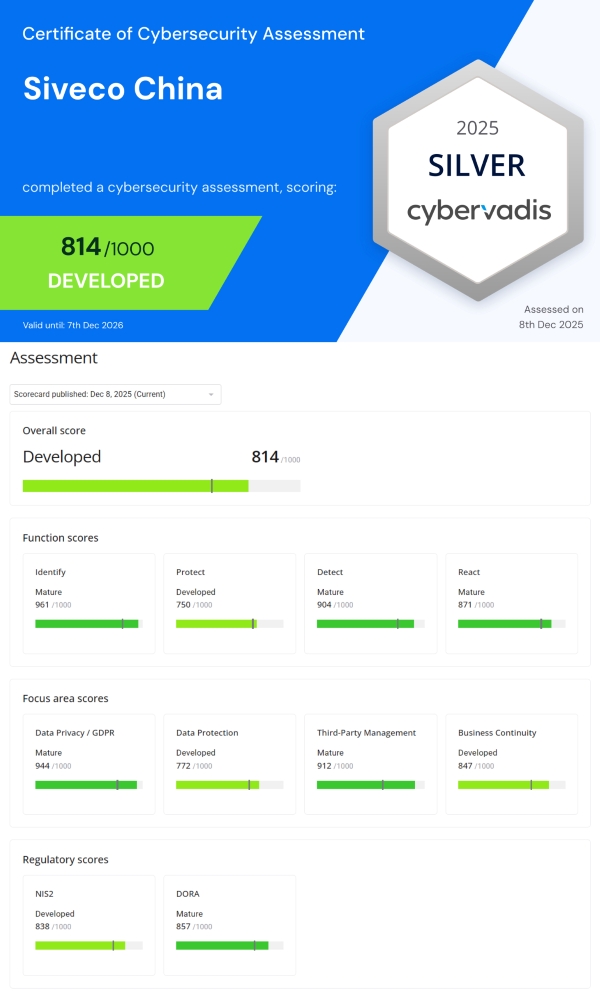 客户可发送邮件至info@sivecochina.com获取完整的CyberVadis评估报告副本,以便高效完成供应商风险评估流程。